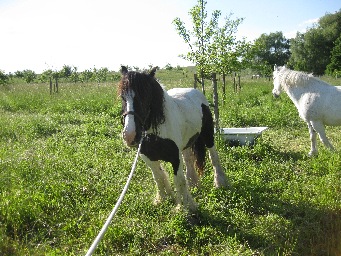 Diesmal griff ich gleich ins Halfter und konnte mein Seil einhaken. Ich streichelte ihn noch kurz und ging los. Guy nicht. Er blieb stehen. Mir war, als hätte ich ihn soeben "Nö!" sagen hören. Langsam waren wohl meine Nerven etwas überreizt. Alle vier Beine hatte er in den Boden gerammt; an Losgehen in Richtung Ausgang war überhaupt nicht zu denken. Ich schaffte es, ihn nach rechts mitgehen zu lassen. Auch in die andere Richtung war es kein Problem. Also lag es nicht daran, dass er nicht neben mir hergehen wollte, weil er sich vielleicht für meine nassen Hosen schämte. Nein, das war es nicht. Sobald ich aber wieder den Ausgang des Obstgartens ansteuerte, blieb er stehen. Ich glaube, er hatte heute keine Lust, diesen zu verlassen. Offensichtlich würde er mich also durchaus in seine Herde integrieren; aber er würde der Chef bleiben wollen. Und zwar hier. Damit war ich allerdings nicht ganz einverstanden. Was tun?