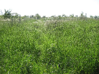 Also griff ich Führseil und Gerte aus dem Auto, hängte mir das in Schlaufen zusammengelegte Seil über die Schulter, überlegte kurz, was ich eigentlich mit der Gerte wollte, nahm sie aber dennoch mit, und machte mich auf den mir eben beschriebenen Weg zum neuen Aufenthaltsort "meines" Pferdes: Ich ging die Straße, die ich kurz zuvor mit dem Auto entlanggefahren war, zu Fuß wieder zurück und bog auf die Hauptstraße des Dorfes ab. Nach einer Weile fand ich auch den beschriebenen Weg, den ich nicht verfehlen sollte. Ich war froh, dass bis hierher alles glattgegangen war; jetzt sollte es nicht mehr weit sein. Genau, das dort vorn sieht aus wie eine Obstplantage. Hier müßte also bald die Koppel zum Vorschein kommen, wo ich den Draht lösen sollte, um hineinzugelangen. Als ich das Ende der Umzäunung der Plantage erreicht hatte, entdeckte ich einen Trampelpfad direkt links neben dem Zaun durch's hüfthohe, nasse Gras. Wahrscheinlich sind sie gestern hier mit den Pferden hochgegangen, dachte ich. Denn da vorn beginnt schon die zweite Obstplantage mit einer ebenso hohen Umzäunung; dort kann es nicht sein. Pferde waren nirgendwo zu sehen. Und so bog ich nach links auf den Trampelpfad ab. Der führte bergauf. Das Gras wuchs immer höher, der Trampelpfad war immer undeutlicher auszumachen, meine Hosenbeine wurden immer nasser und schwerer. Als ich endlich oben auf dem Berg angekommen war, sah ich das Ende der Plantage, an der ich bis zu diesem Moment entlanggelaufen war. Und was sah ich da?! - Feld! Weites Kornfeld! Und nicht die Spur einer Koppel!