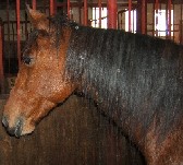 Er ist nicht sehr groß und ein junger Traber, braun. Er war ein Urlaubspferd für mich und hat mir auf Anhieb gefallen. Ich hätte ihn in die Kategorie "Kuschelpferd" eingeordnet. Putzen, Satteln und Trensen ging prima. Was ihm Schwierigkeiten bereitete war, eine ganze Stunde lang am Zügel zu gehen. Es war nötig, immer wieder Pausen zu machen, also ihm die Zügel ein paar Momente zu lassen. Man muß dazu aber wissen, daß sein Reiterhof fast ein reiner Ferienbetrieb ist. Für eine Woche kommen also immer wieder meist Anfänger, und wollen bei ihm Reiten lernen, oder lassen sich durch die Gegend tragen. Also woher soll er das können? Wenn man das berücksichtigt, dann hat er seine Sache gut gemacht. Für mich war das Reiten viel schwieriger, als daheim. Aber das schadet nichts; schön war es trotzdem.
