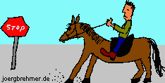 Nachdem wir nun eine schöne Strecke im Schritt zurückgelegt haben, wollen wir uns Gedanken über das Anhalten machen. Viele Schulpferde halten irgendwie an, wenn man am Zügel zieht. Da das Pferd aber Kopf und Hals zum Ausbalancieren benötigt (auch beim Anhalten), behindert man das Pferd sehr. Manche Pferde wehren sich auch gegen den festgezogenen Zügel und halten nicht an.Solange wir ganze Paraden noch nicht richtig anwenden können, halten wir deshalb so an: Tief einatmen, dabei Schultern hoch- und leicht zurücknehmen (nach hinten rollen), die Unterarme mit den Zügeln dabei mitnehmen. Ruhig ausatmen (währenddessen vielleicht lang "Haaalt" sagen), dabei die Schultern wieder absenken, so daß die Zügel wieder nach vorn gehen. Wenn das Pferd anhält, Zügel nachgeben (aber den Kontakt halten). Mehr ist nicht nötig. Wie man "vorschriftsmäßig" anhält, lernen wir später, wenn es um halbe und ganze Paraden geht. |