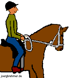 Empfindlichen Pferden genügt dies schon als wechselseitige treibende Hilfe in der Gangart Schritt. Dies ist damit gemeint, wenn es heißt, das Pferd hole sich seine treibende Hilfe im Schritt von selbst ab. Den meisten Pferden reicht dies aber nicht. Bei ihnen muß man den Druck verstärken: Immer, wenn der Pferdebauch gegen mein Bein drückt, drücke ich sozusagen zurück gegen den Bauch des Pferdes; wechselseitig, rechts und links. Das tue ich solange, bis das Pferd schnell genug geht; dann lasse ich wieder nach (sonst verliert das Treiben seine Wirkung). Wird das Pferd wieder langsamer, beginne ich sofort wieder verstärkt zu treiben (siehe oben, "Tataanmeamitt!").Soviel zum "Standard". Leider hatte auch dies, nachdem ich es verstanden hatte, mein damaliges Pferd nicht sonderlich beeindruckt. Vielleicht ein bißchen, ja. Es dauerte nun sicherlich länger, bis sich der Abstand zum Vordermann wieder merklich vergrößert hatte. Wenn man deshalb versucht, den Druckimpuls kürzer, dafür aber deutlicher zu geben, kann man bessere Erfolge erzielen.< |