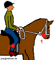 Das Prinzip des Zweiten Punktes gilt auch für sich allein genommen auf die Handhabung der Zügel: Wenn ich nur an einem Zügel ziehe, erzeuge ich einen sehr unspezifischen Reiz, der, wenn ich dem Pferd die Trense durch's Maul ziehe, auch noch schmerzhaft sein kann. Halte ich allerdings mit dem äußeren Zügel leicht dagegen, schaffe ich einen Gegenpol, den "Zweiten Punkt". So spürt das Pferd wesentlich genauer die nach Rückwärts gerichtete Einwirkung des inneren Zügels. Durch die gleichzeitigen Impulse des inneren Schenkels (Biegepunkt), wende ich das Prinzip des Zweiten Punktes praktisch noch einmal übergeordnet an. Und noch ein drittes Mal wirkt dieses Prinzip in den Signalen der Schenkel: Der innere Schenkel stellt wieder den Biegepunkt dar, der äußere Schenkel, der ja beim Reiten einer Wendung nach hinten verlagert wird, stellt den Gegenpol dar, genauso, wie zuvor besprochen, der Zügel. |