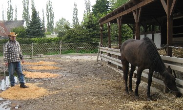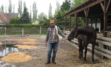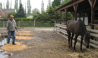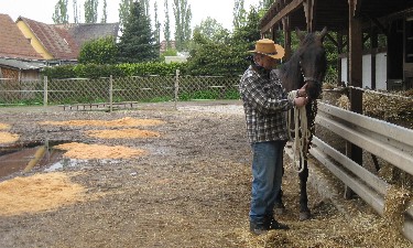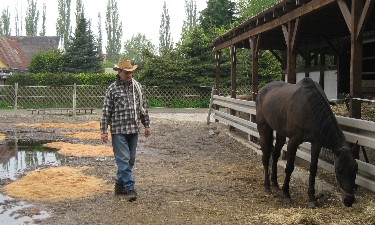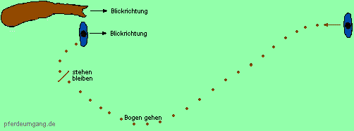Annäherung an ein Pferd - Auf das Pferd zugehenWenn wir z.B. auf der Weide oder Koppel auf das Pferd zugehen, tun wir das am besten von der Seite, von seitlich-vorn oder von seitlich-hinten, niemals aber frontal oder von hinten. Um das zu erreichen, wenn uns das Pferd Kopf oder Hinterteil zuwendet, und auf Rufen nicht reagiert, können wir einen Bogen gehen, um von der Seite an das Pferd herantreten zu können. Damit sagen wir dem Pferd in etwa: "Hallo Kollege, ich komme mit freundlichen Absichten auf dich zu."Wenn ich so beim Pferd angekommen bin, sollte ich mich so drehen, dass ich dieselbe Blickrichtung wie mein Pferd habe.
