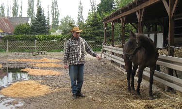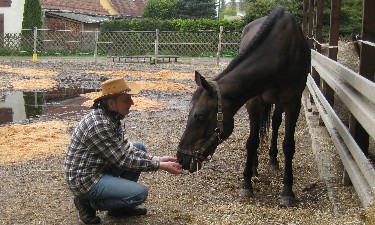 Während der gesamten Annäherungsprozedur blicke ich dem Pferd nicht direkt in die Augen (siehe nächsten Artikel "Blicke"). Befreundete Pferde tun das alles genau so. Freundliches AnklopfenWenn ich den Eindruck, dass ich selbst auch ein Pferd, und zwar eines mit freundlichen Absichten bin, noch verstärken will, kann ich auf dem Weg zu meinem Pferd im Abstand von 7-10 Metern für ein paar Sekunden stehenbleiben - und zwar genau dann wenn das Pferd für einen Moment den Kopf ganz leicht in meine Richtung hebt, oder wenigstens kurz ein Ohr zu mir dreht - und erst dann meinen Weg ruhig fortsetzen. An diesem Punkt habe ich den Individualbereich des Pferdes erreicht. Während ich stehe, schaue ich mich ruhig in der Gegend um. Pferde tun das auch so. Sie beachten so den Individualbereich des anderen Pferdes: Sie kommen dem anderen Pferd näher, warten ab, ob das andere Pferd einverstanden ist, und nähern sich erst dann weiter: "Ich beachte deinen Individualbereich und will nichts tun, was dich aufregt oder dir nicht gefällt."Aus Sicht des Pferdes hat das Stehenbleiben an der Grenze zu seinem Individualbereich in etwa die Bedeutung von Anklopfen an seiner Tür. Das In-der-Gegend-Umschauen zeigt ihm, daß ich - genauso wie ein anderes Pferd - unsere Umgebung sichere, indem ich nach Gefahren (Raubtieren) Ausschau halte. Für das Pferd wirkt das vertraut und vertrauenserweckend: "Aha, der Zweibeiner benimmt sich ja wie ein Pferd. Außerdem paßt er auf gefährliche Pferdefresser auf. Er will mir diese Arbeit abnehmen. Das ist gut so, dann muß ich nicht mehr selbst so aufpassen! Bei dem bleibe ich." Ich lade dich ein...Spätestens beim Erreichen seiner Individualdistanz wendet das Pferd mir also das erste Mal während meiner Annäherung kurz seine Aufmerksamkeit zu. Wenn ich noch näher herangekommen bin (auf ca. 3 Meter), und mir das Pferd entgültig und deutlich den Kopf zuwendet, ist der Moment günstig, den Bogen eng zu ziehen, die gleiche Blickrichtung wie das Pferd einzunehmen, ihm einladend die Schulter zuzuwenden und stehenzubleiben. Nun ist die Wahrscheinlichkeit groß, daß das Pferd den Rest des Weges bis zu unserem Treffen übernimmt.Das Ganze hat den Charakter eines Freundschaftsangebotes und einer Einladung. Ob das Pferd sie annimmt, liegt bei ihm. Falls noch ein Wegstück fehlen sollte, lege ich den Rest des Weges wieder im Bogen bis zum Pferd zurück (wie oben). Zur Begrüßung halte ich dem Pferd die Oberseite meiner Hand zum Beschnuppern hin, bevor ich es streichle. Und wenn ich keine Zeit habe, stehenzubleiben?Während der Annäherung an das Pferd stehenzubleiben kann ein ganz wichtiger "Schritt" sein. Vor allem dann, wenn das Pferd beginnt, sich zu entfernen. Würde ich jetzt weitergehen oder meinen Schritt sogar noch beschleunigen, hätte ich keine Chance, das Pferd einzufangen. Es würde ebenfalls immer schneller laufen, um den Abstand zu mir nur ja nicht zu verkleinern. Bemerke ich, daß das Pferd sich entfernen will (das ist eigentlich schon fast zu spät), bleibe ich sofort wie angewachsen stehen. Ich kann zur Bekräftigung sogar noch einen Schritt zurückgehen. Dann warte ich mit gesenktem Blick und entspannter Haltung wenigstens 15-30 Sekunden, manchmal länger, bevor ich langsam wenige weitere Schritte auf das Pferd zugehe. Spätestens, wenn das Pferd darüber nachzudenken beginnt, sich wiederum aus dem Staub zu machen, bleibe ich sofort wieder stehen und warte.Mit dieser Methode ist es mir bereits mehrfach passiert, daß ein Pferd, das sich anfangs von mir entfernen wollte, es sich anders überlegt hat, und zu mir kam, oder sich wenigstens holen ließ. Die in das Stehenbleiben und Warten investierten Minuten sind ungleich kürzer, als dem Pferd vielleicht eine Stunde lang hinterherzurennen und es dann doch nicht einzufangen. Wenn ich jetzt die Möglichkeit habe, mich nach ein paar Minuten wieder zu verabschieden, ohne das Pferd "zur Arbeit" mitschleifen zu müssen, kommt es das nächste Mal vielleicht ganz von selbst auf mich zu. Hier ein nettes Beispiel, wie sehr die Nutzung der Pferdesprache die Situation vereinfachen kann: