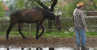 Ach ja, wenn das Pferd zu mir kommt, drehe ich mich noch weiter in die Richtung, in die das Pferd schaut, so daß wir beide die gleiche Blickrichtung haben. Das verstärkt den Effekt und beinhaltet in etwa sie Aussage: "Ich bin mit freundlichen Absichten hier."