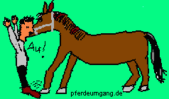 Darüber sollte man wirklich vorher nachdenken. Wenn man richtig reagiert, kann man größeren Schaden nämlich zumeist abwenden. Was nicht funktioniert ist, den eigenen Fuß unter dem des Pferdes wieder hervorziehen zu wollen. - Das Pferd ist zu schwer. Zetern und verzweifelt schimpfen nützt ebenfalls nichts, weil das Pferd nicht weiß, was eigentlich los ist. - Es wird nicht erwartungs- (oder hoffnungs-)gemäß reagieren. Versucht man, das Pferd wegzudrücken, kann man die Situation noch weiter verschlimmern, wenn das Pferd nämlich mit Gegendruck antwortet und sein Gewicht dazu auf die Seite meines Fußes verlagert. Was also tun? Sofort möglichst routiniert mit der Hand am Pferdebein herunterrutschen, "Fuß" sagen und den Huf aufnehmen, als wenn man ihn auskratzen wollte. Dann natürlich den eigenen Fuß (oder was von ihm übrig ist) wegziehen. Erst jetzt dürfen Tränen und Schmerzensschreie meinen Körper endlich verlassen... |