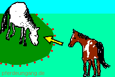 Wenn wir Menschen Umgang mit Pferden haben, müssen wir immer wieder den Individualbereich unseres Pferdes betreten können. Konsequenzen für den ReiterWenn wir ein Pferd von der Weide abholen wollen, kann es vorkommen, daß das Pferd, nachdem wir uns bis auf ein paar Meter angenähert haben, uns sein Hinterteil zuwendet und langsam von uns weggeht.Bleiben wir dann sofort stehen, wird auch das Pferd eventuell stehenbleiben. Wir können einen neuen Annäherungsversuch starten (Bogen gehen, um nicht von hinten an das Pferd heranzutreten). Dabei sollten wir diesmal von selbst schon vor Erreichen der Distanz, bei der das Pferd vorher begann wegzulaufen, einen Augenblick stehenbleiben und warten, bevor wir wieder ein paar Meter gehen, um erneut zu warten (vielleicht je 15 Sekunden). So haben wir eine größere Chance, ein solches Pferd doch noch zu erreichen. Woran erkenne ich die Individualdistanz eines Pferdes schon vorher?Ab einer Entfernung von vielleicht 10 Metern muß ich anfangen, darauf zu achten: Normalerweise hat ein Pferd seinen Kopf nach unten ins Gras gesenkt um dort zu fressen. Ab und zu kontrolliert es für einen Moment die Umgebung, um gleich wieder weiterzufressen. Hebt das Pferd während ich mich annähere auch nur ein wenig seinen Kopf und deutet ein Kopfdrehung in meine Richtung an, wendet es mir für diesen kleinen Moment seine Aufmerksamkeit zu. Das passiert vor allem, wenn ich seinen Individualbereich betrete. Dann bleibe ich sofort für ein paar Sekunden (z. B. 15-30s) stehen und schaue mich ruhig in der Gegend um. Das Pferd senkt meist seinen Kopf wieder; ich gehe weiter.Aus Sicht des Pferdes hat das in etwa die Bedeutung von Anklopfen an seiner Tür. Das In-der-Gegend-Umschauen zeigt ihm, daß ich - wie ein anderes Pferd - unsere Umgebung sichere, indem ich nach Gefahren (Raubtieren) Ausschau halte. Siehe auch: Sprache - Annäherung ans Pferd |